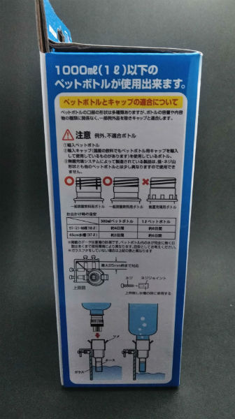 水面に当たる風次第なような気もしますが、パッケージの記載では、45cm水槽で対して500mlのペットボトルで3日間、1Lのものでは6日間、補充し続けてくれるようです。